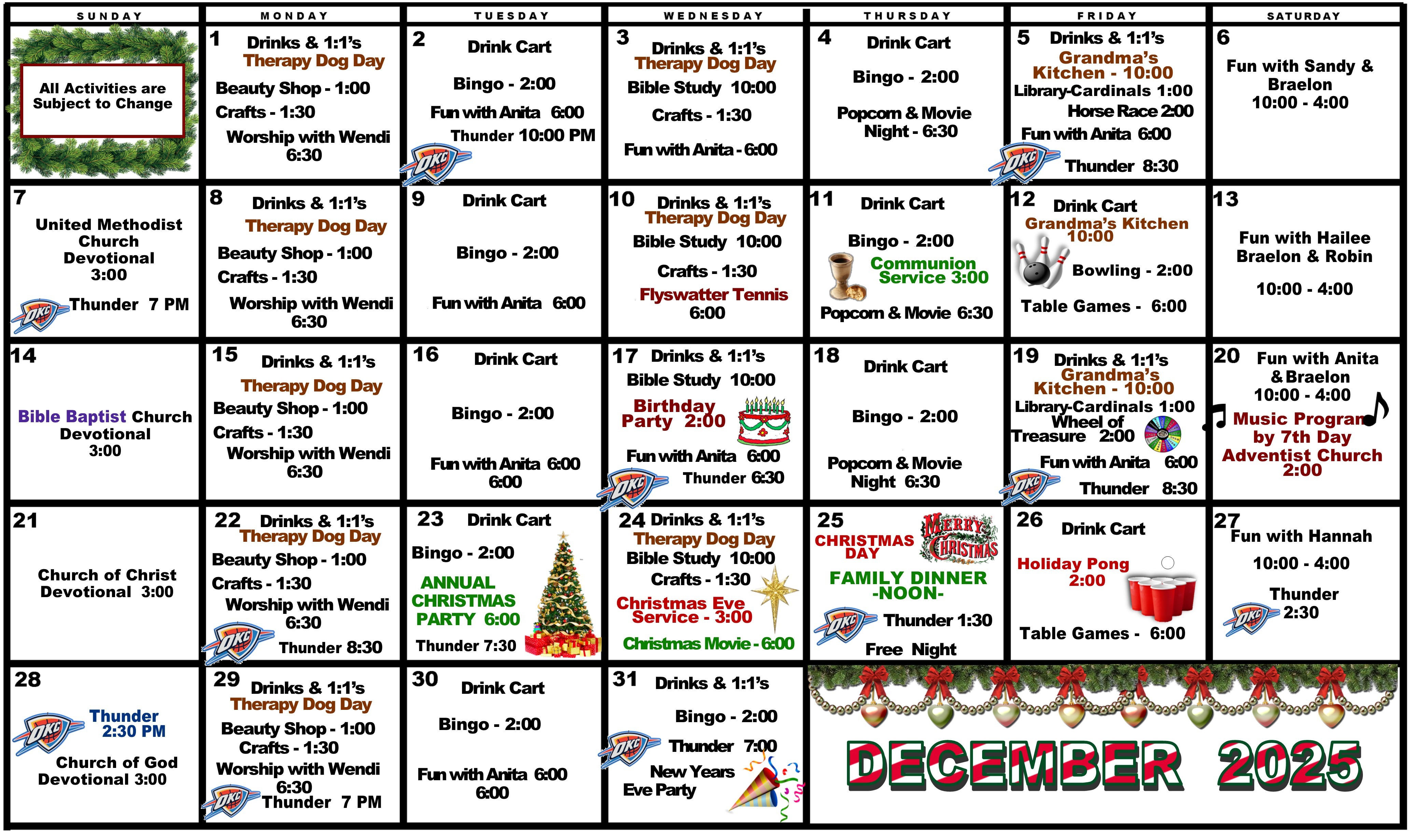 Beadles Nursing Activity Program endeavors to stimulate residents cognitively, physically and spiritually. Our goal is to promote self-esteem and independence through, small and large groups, music, games and outings.